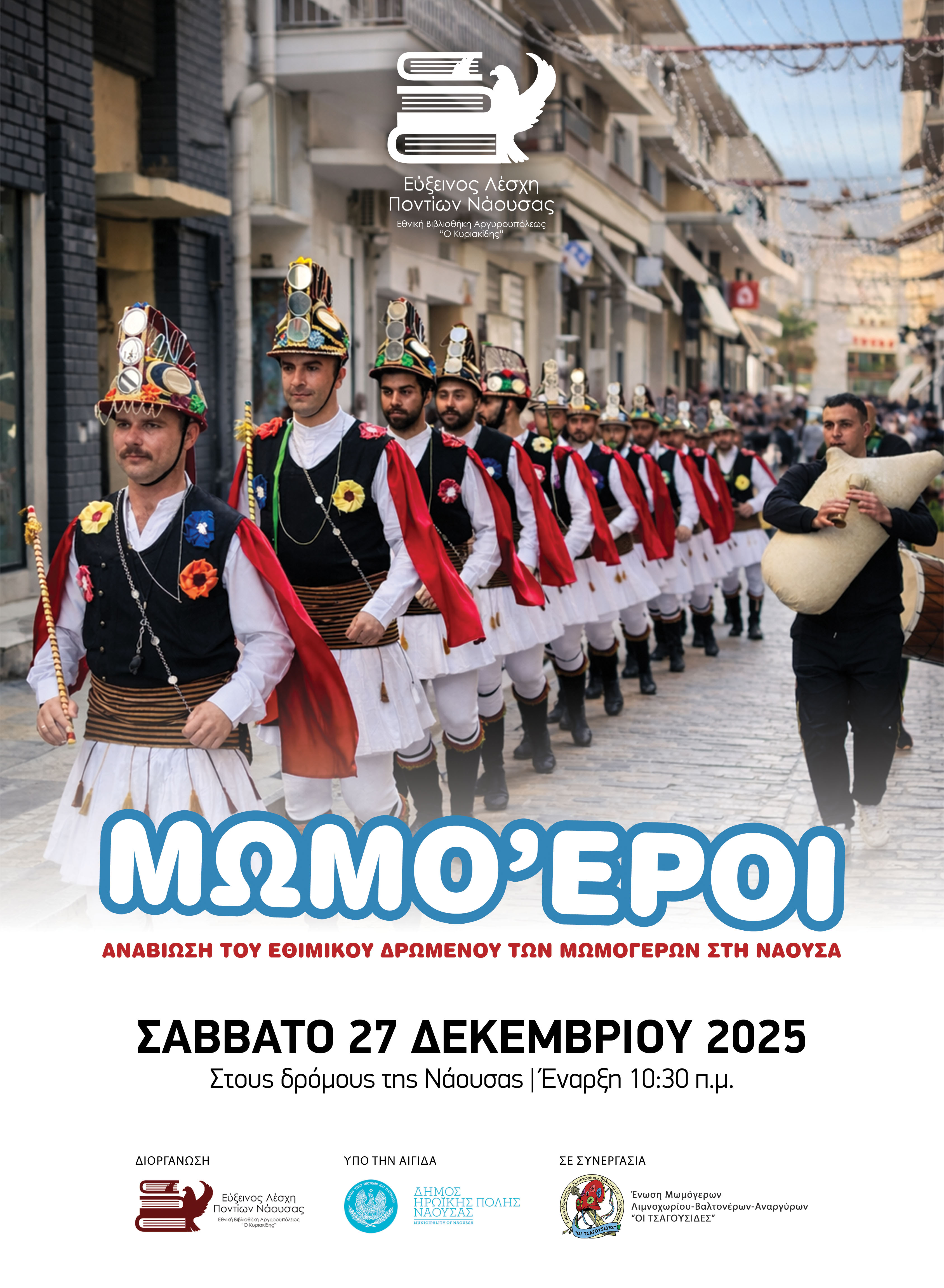 Η Νάουσα υποδέχεται και φέτος το πανάρχαιο ποντιακό έθιμο των Μωμόγερων, το Σάββατο 27 Δεκεμβρίου 2025, υπό την διοργάνωση της Ευξείνου Λέσχης Ποντίων Νάουσας. Από τις 10:30 π.μ., με αφετηρία το κτίριο του σωματείου, οι Μωμόγεροι, η Νύφη, ο Διάβολον, ο Γέρον, η Γραία και οι υπόλοιποι συμβολικοί χαρακτήρες θα διασχίσουν τους κεντρικούς δρόμους της πόλης, μεταφέροντας το τελετουργικό και εορταστικό δρώμενο στο αστικό τοπίο.
