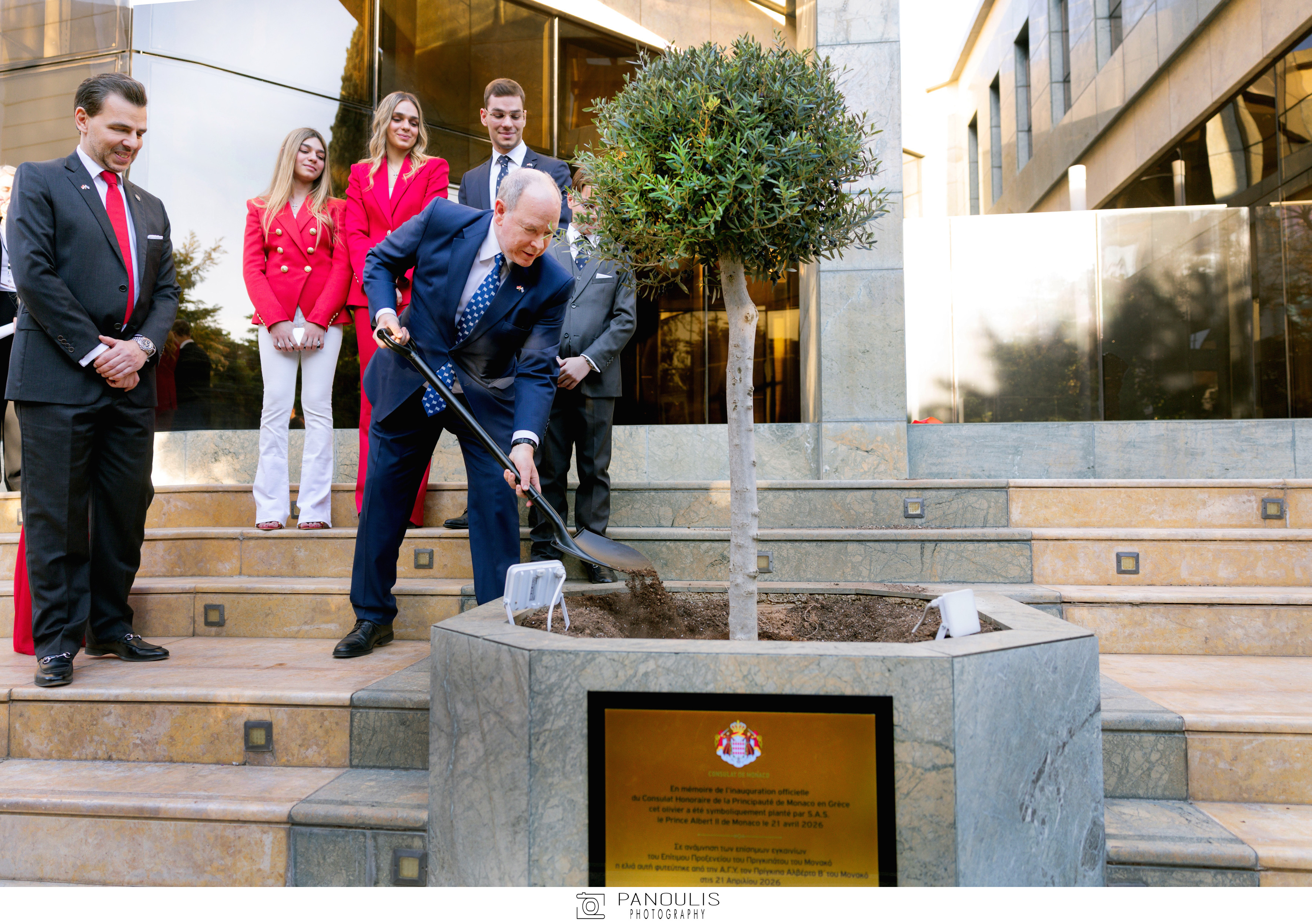 (Ο Πρίγκιπας Αλβέρτος Β’ του Μονακό κατά τη συμβολική φύτευση ελιάς στον εξωτερικό χώρο του Προξενείου)