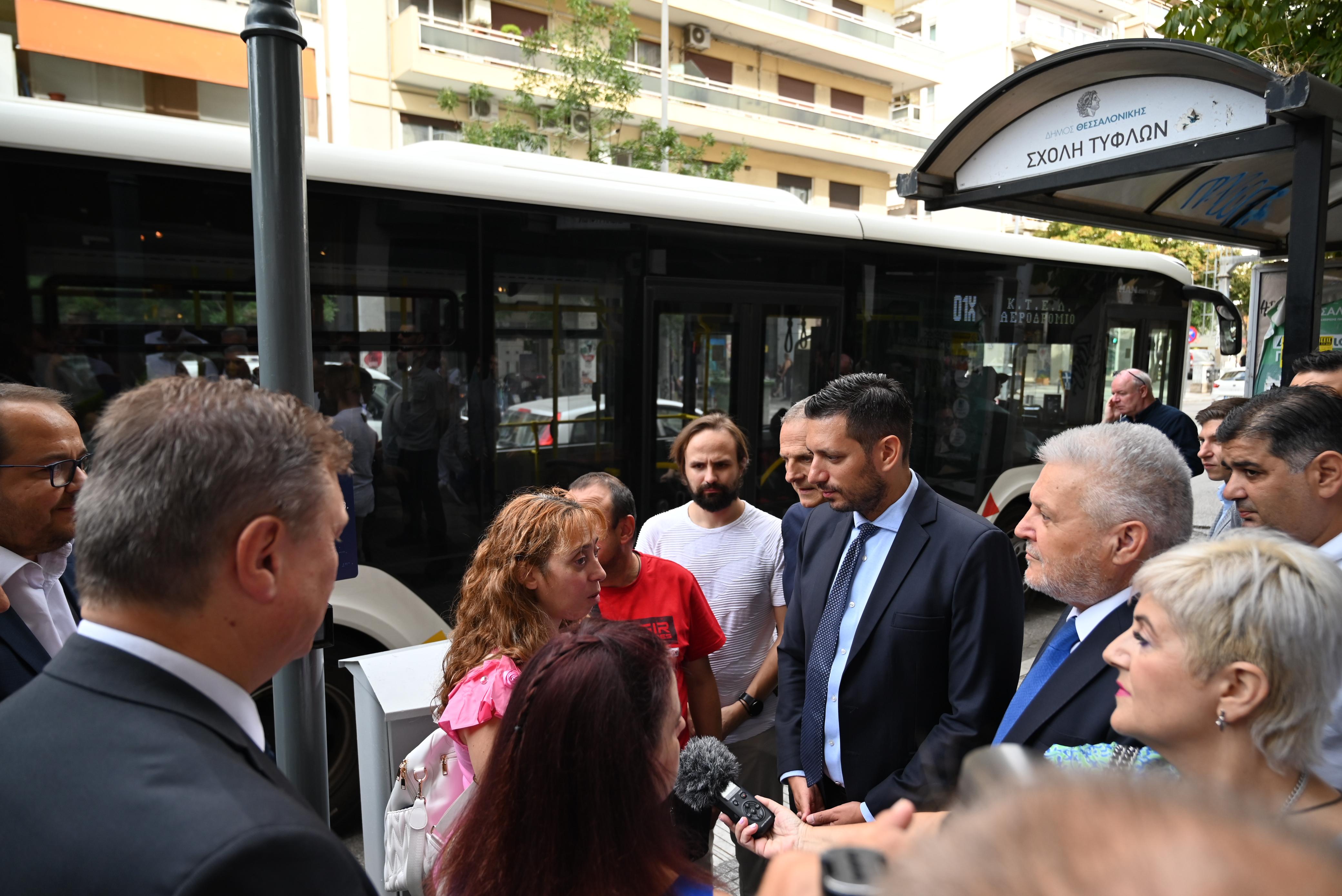 Κεντρικής Μακεδονίας του Πανελληνίου Συνδέσμου Τυφλών Δημήτρης Μισερλής, ενώ η ταμίας της Ένωσης Κατερίνα Λορέντζου είπε χαρακτηριστικά: «Θερμά συγχαρητήρια στον ΟΑΣΘ διότι πάντα είναι δίπλα στον Πανελλήνιο Σύνδεσμο Τυφλών και έχουμε άψογη συνεργασία, όλα τα χρόνια, ανταποκρίνονται στα αιτήματά μας. Τώρα είναι μια καινοτόμα ιδέα και αυτή, να μπουν πινακίδες με τη γραφή Braille, ο κώδικας για τα άτομα με οπτική αναπηρία, έτσι ώστε και εμείς να μπορούμε, πέρα από την ηχητική πληροφορία που έχουμε από κάποιες στάσεις που μιλάνε, να έχουμε και την πρόσβαση άμεσα, ποια γραμμή περνάει από τη συγκεκριμένη στάση, το όνομά της, αλλά και τον κωδικό της. Αποδεικνύεται ότι ο ΟΑΣΘ εξυπηρετεί όλους τους επιβάτες και με αναπηρία και χωρίς».