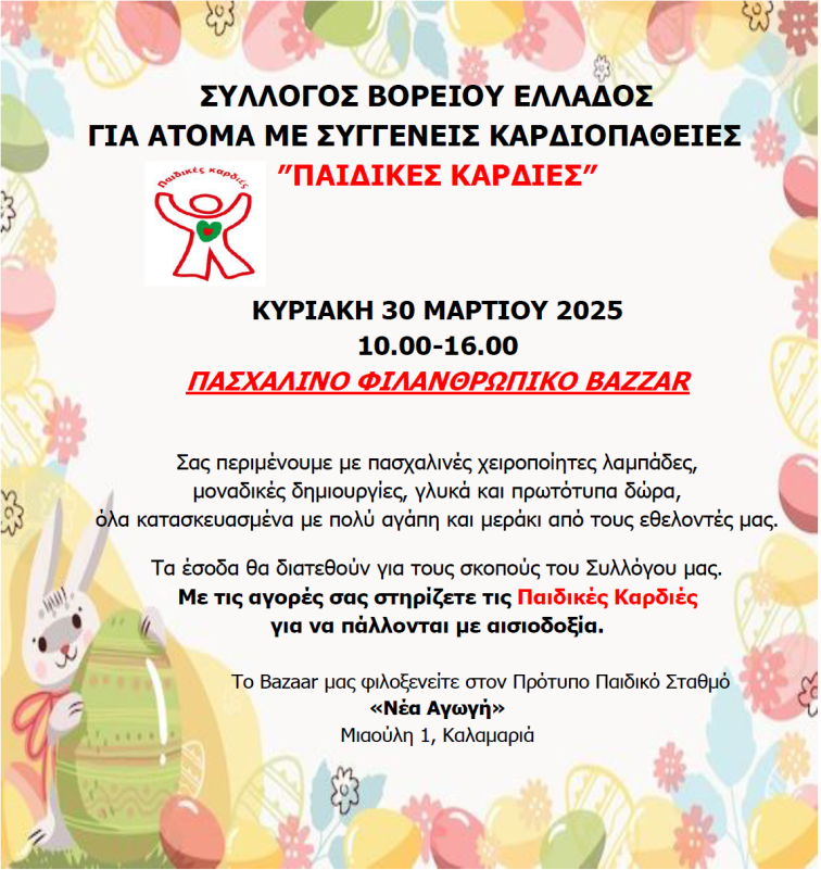 Ο Σύλλογος Βορείου Ελλάδος για Άτομα με Συγγενείς Καρδιοπάθειες "Παιδικές Καρδιές" διοργανώνει πασχαλινό φιλανθρωπικό bazaar την Κυριακή 30 Μαρτίου 2025, από τις 10:00 έως τις 16:00, στον Πρότυπο Παιδικό Σταθμό "Νέα Αγωγή" στην Καλαμαριά.