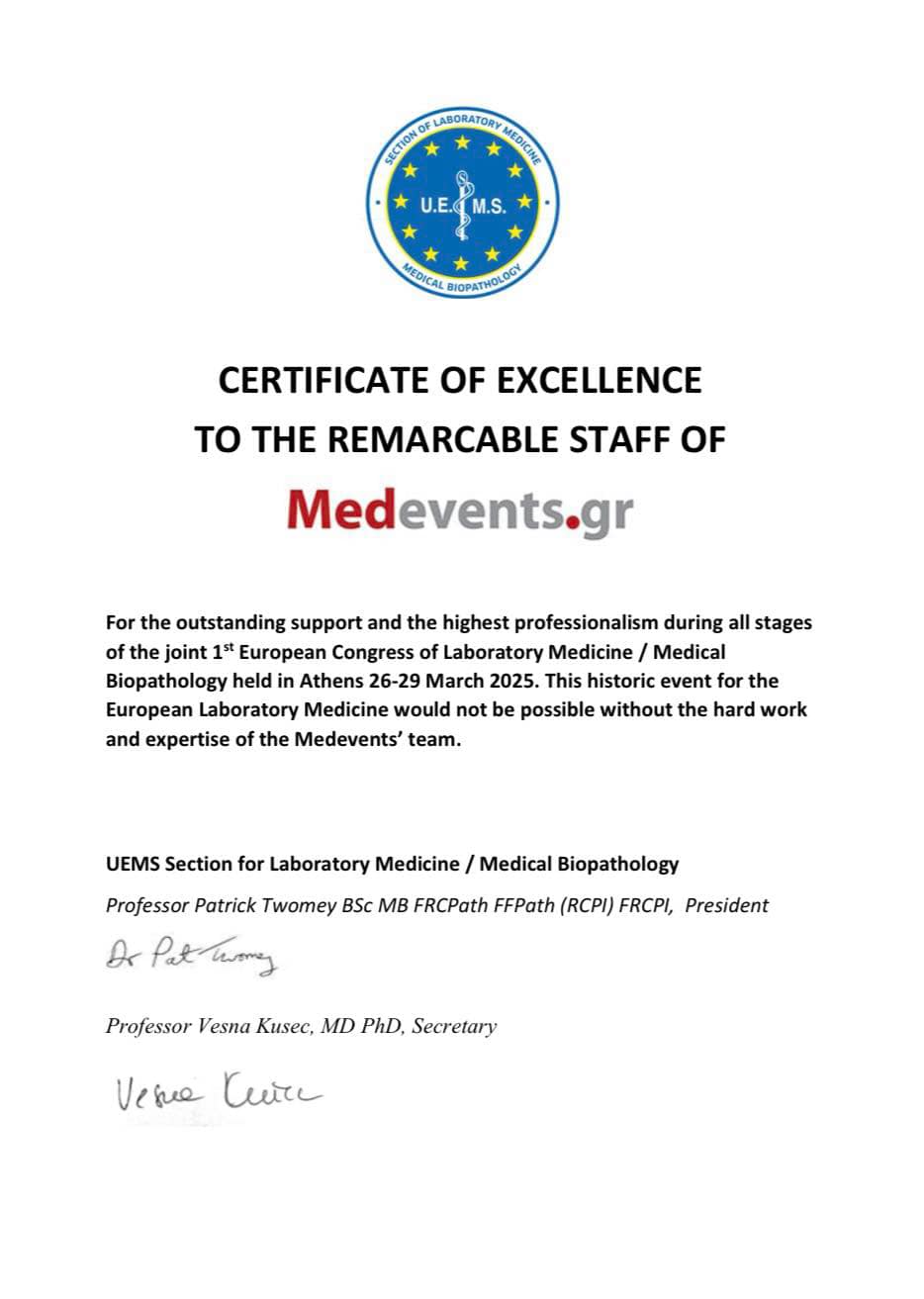 Στο σχετικό πιστοποιητικό, η UEMS Section for Laboratory Medicine / Medical Biopathology επισημαίνει ότι το ιστορικό αυτό συνέδριο δεν θα μπορούσε να πραγματοποιηθεί χωρίς τη σκληρή δουλειά και την εξειδίκευση της ομάδας του Medevents. Η άρτια οργάνωση, η προσοχή στη λεπτομέρεια και η δέσμευση στην άριστη παροχή υπηρεσιών συνέβαλαν καθοριστικά στην επιτυχία της εκδήλωσης.