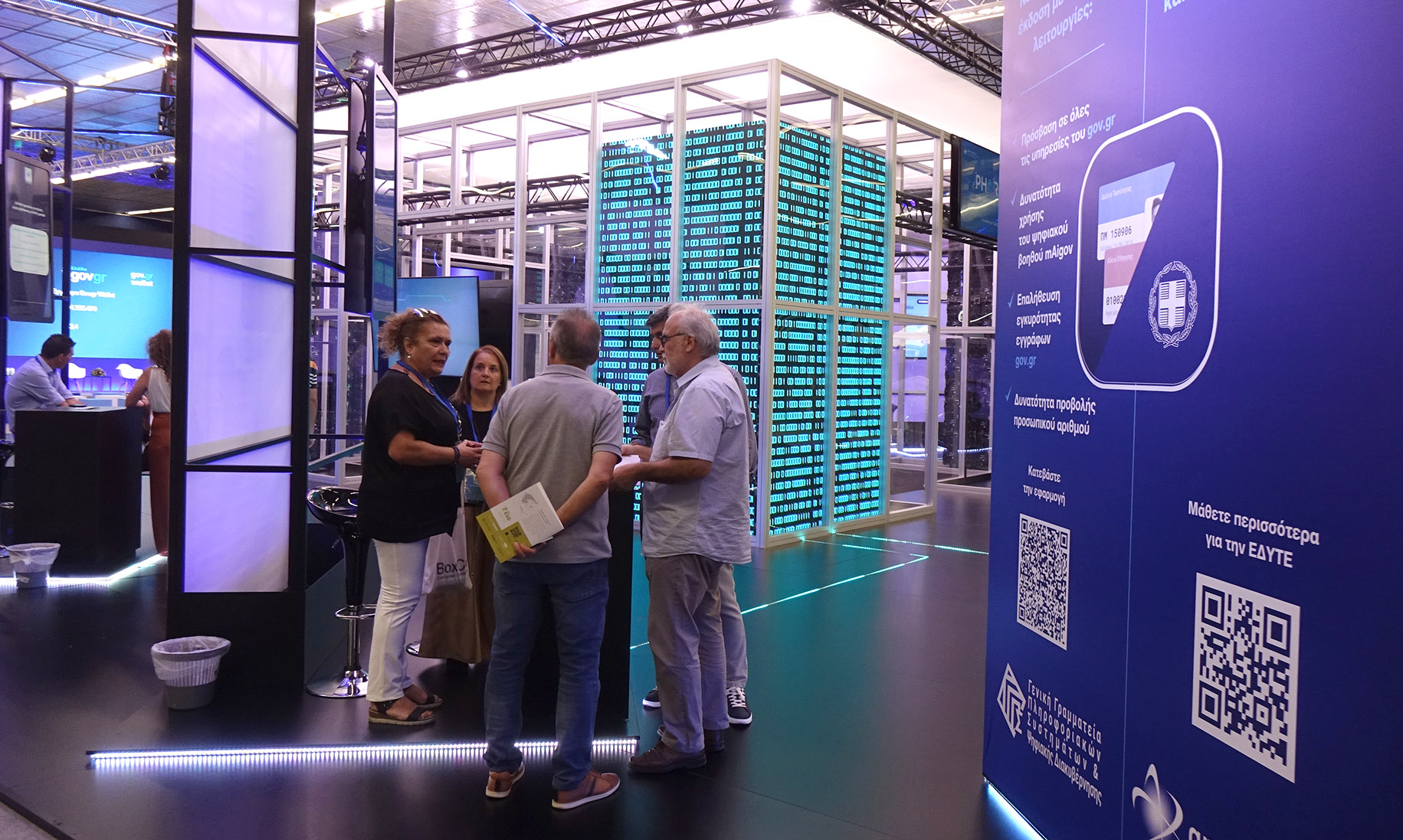 Στο κέντρο του περιπτέρου 12, όπου φιλοξενείται το υπουργείο Ψηφιακής Διακυβέρνησης και η Ελλάδα του gov.gr, δεσπόζει η προσομοίωση του υπερυπολογιστή «ΔΑΙΔΑΛΟΣ» και του «PHAROS» AI FACTORY. Ο «ΔΑΙΔΑΛΟΣ» είναι ο πυρήνας του «PHAROS» AI FACTORY, που θα παρέχει υπολογιστική ισχύ, δεδομένα και τεχνογνωσία σε startups, πανεπιστήμια και ερευνητικά κέντρα, ώστε να αναπτύξουν εφαρμογές Τεχνητής Νοημοσύνης. Επίσης, με έναν διαδραστικό τρόπο παρουσιάζονται τα τεχνολογικά μέτρα για την Οδική Ασφάλεια. Ειδικότερα, υπάρχει κάμερα, η οποία σε πραγματικό χρόνο καταγράφει παραβάσεις, όπως η μη χρήση ζώνης και η χρήση κινητού τηλεφώνου κατά την οδήγηση αυτοκινήτου, αναδεικνύοντας τον ρόλο της τεχνολογίας στην προστασία της ανθρώπινης ζωής. Παράλληλα, οι επισκέπτες έχουν τη δυνατότητα να περιηγηθούν σε ειδικά διαμορφωμένα booths που παρουσιάζουν εμβληματικά έργα και υπηρεσίες του υπουργείου. Στο ίδιο περίπτερο φιλοξενούνται και καινοτόμες startups.
