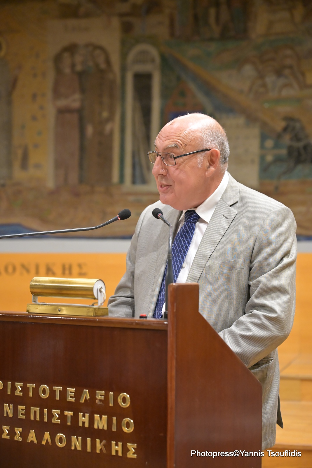 Με αφορμή από τους επικείμενους εορτασμούς των 100 χρόνων του ΑΠΘ, τόνισε ότι η σχέση όσων αποχωρούν φέτος με το Αριστοτέλειο, ξεκινά πριν ακριβώς 50 χρόνια, το 1975, όταν το Πανεπιστήμιο Θεσσαλονίκης γιόρταζε τότε τα 50 χρόνια λειτουργίας του. Αναφέρθηκε στην εκλαϊκευμένη νομική μελέτη, με τίτλο «Η Συνταγματική Προστασία της Ακαδημαϊκής Ελευθερίας», του Αριστόβουλου Μάνεση, διακεκριμένου Καθηγητή της Νομικής του ΑΠΘ την περίοδο εκείνη, που είχε κυκλοφορήσει στο πλαίσιο των τότε εορτασμών των 50 χρόνων του ΑΠΘ, για να διαπιστώσει ότι η ελεύθερη υποστήριξη οποιασδήποτε επιστημονικής άποψης, είναι βασικό συστατικό της πανεπιστημιακής λειτουργίας -ίσως μόνο του πανεπιστημιακού χώρου εργασίας- και δεν έχει άλλο τρόπο αντίκρουσης παρά μόνο την πειθώ με επιχειρήματα ή την αποδοχή ότι μπορούν να συνυπάρχουν διαφορετικές απόψεις στο πανεπιστήμιο.