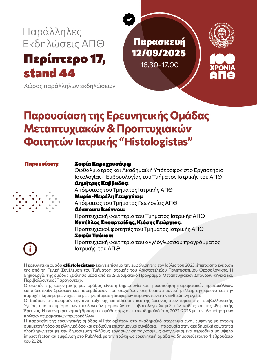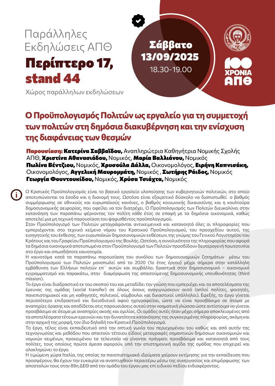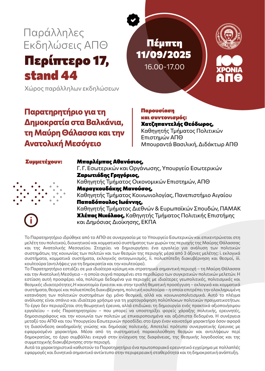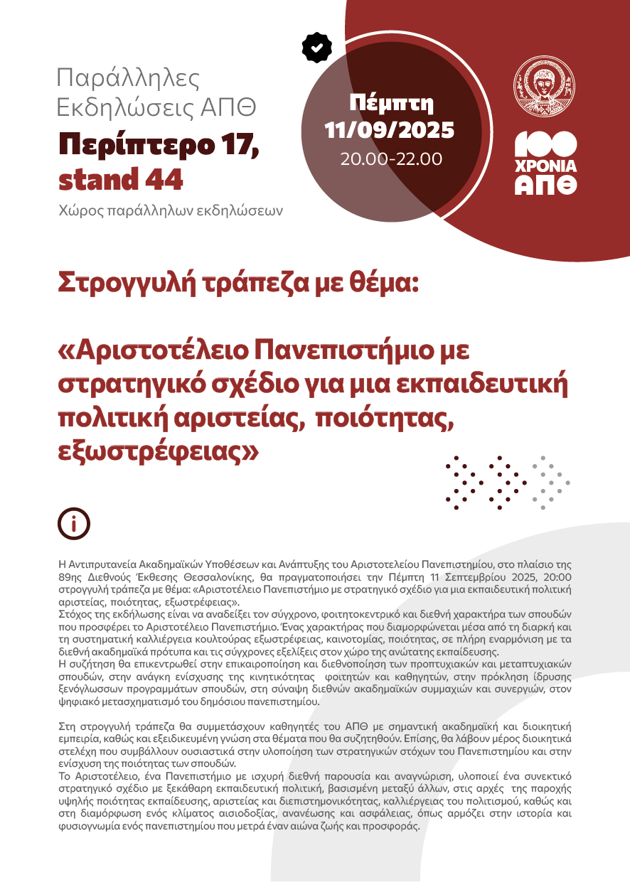 Το Αριστοτέλειο Πανεπιστήμιο συμμετέχει δυναμικά στην 89η Διεθνή Έκθεση Θεσσαλονίκης, από 6 έως 14 Σεπτεμβρίου 2025, αναδεικνύοντας τα ακαδημαϊκά και ερευνητικά επιτεύγματά του, με καινοτόμα εκθέματα, εφαρμογές, ερευνητικά προγράμματα και διοργανώνοντας παράλληλες εκδηλώσεις.